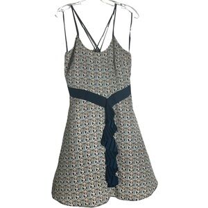 Thin straps that cross in back. Scoop neck. Pleated, navy decoration at waist cascades into a ruffle that falls down the front of the dress. Side zip. Soft a-line silhouette.