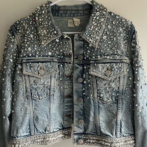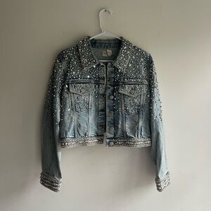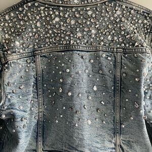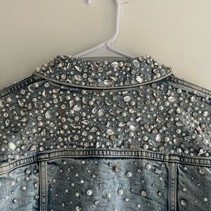 Stylish blue jean jacket. Features intricate embellishments. Perfect for a chic look.