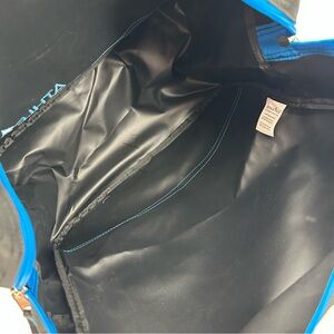 Nice condition ski boot bag features zippered top, mesh exterior pocket, detachable shoulder strap, and 2 handles. Black with blue trim. Listing is for the boot bag with strap only. Similar listings claim bag fits a single pair of ski boots, up to size 13.