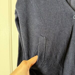 Lululemon Cardi in the Front Cardigan. No size tag but estimated to be a size 4 (please check measurements). Elegant navy blue women's sweater with a classic design. Perfect for layering and adding a touch of sophistication to any outfit. Front pockets. Thumbholes. Super soft. Rayon tencel cashmere blend. Stretchy. Mixed media with fine knit in front and lightweight material in back. Drapey and oversized slouchy fit. There is slight wash wear to the fabric and a small beginning of stitching undone to the right back shoulder (as pictured 2nd to last photo). Otherwise good condition. Great to lounge at home or throw on to run errands or in the office.