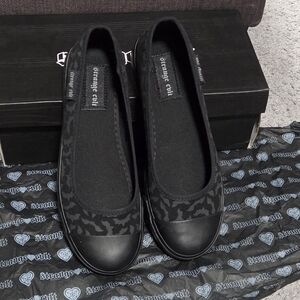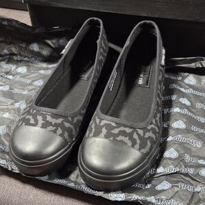 Treat yourself to a blast from the past with these Batty sneaker flats. Featuring a sleek black canvas upper with a printed black bat detail, these mid 2000's dream shoes are both edgy and comfortable. Finished with a black canvas lining and sock, and a black rubber outsole and toe cap.