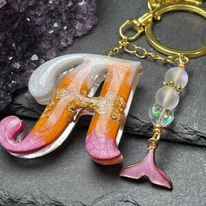 Vibrant resin keychain featuring an initial with pink, orange, and gold accents. Includes decorative beads and a gold keyring.