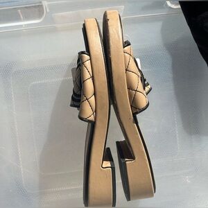 Elegant Chanel sandals with quilted tan and black design. Perfect blend of style and comfort.