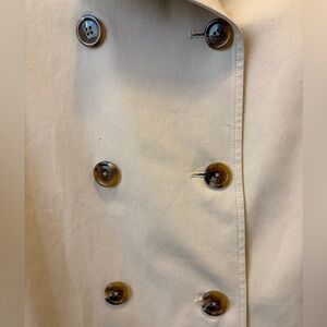 J.Crew women’s trench coat in size 10 Petite. Front double button closure with belt. Made from 100% cotton exterior with a preppy blue and white striped lining. Great condition- no stains or holes. Has a couple of minor thread snags.