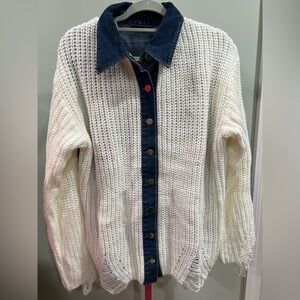 Hot & Delicious chunky knit denim cardigan with a white knit body and blue denim