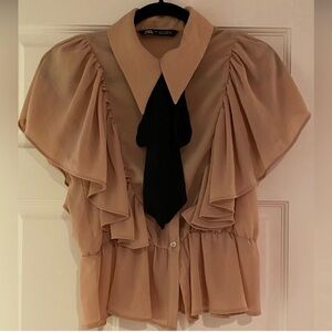 ✨ZARA Blush Chiffon Ruffle Blouse w/ Black Neck Tie | Size L✨