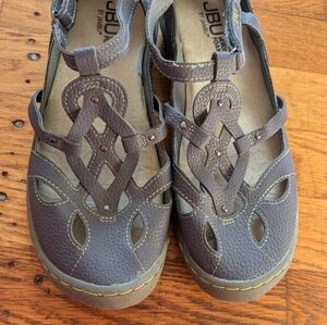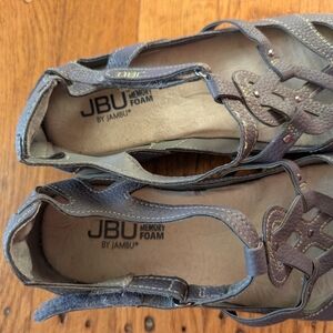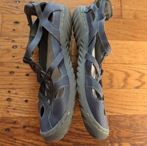 Comfortable and casual, blue gray criss cross sandals with adjustable Velcro straps and memory foam soles.