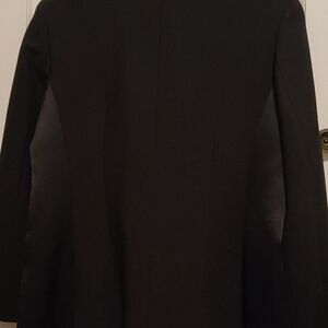 Elegant black blazer featuring satin details. Single bejeweled button closure. Perfect for sophisticated occasions.
