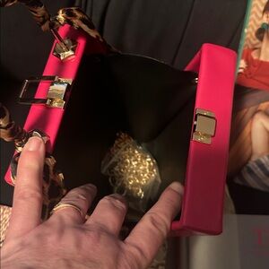 Make a bold statement with this chic red handbag featuring a unique graphic design. Perfect for adding a pop of color to any outfit.