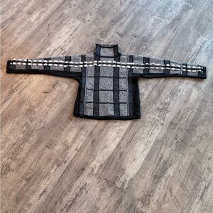 Stylish black and gray plaid sweater with a unique pattern. Perfect for a modern look.