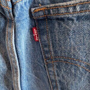 Raw distressed hem, Button fly closure, Classic five-pocket styling, Levi’s red tab and leather patch branding