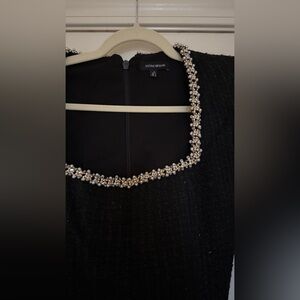 NATALIE is a black mini dress that expresses confidence and class, boasting our signature tulip style skirt and square neckline. The chain pearl trim detailing, intertwined with black velvet fabric, frames the striking square neckline accentuated by internal shoulder pads. This mini features full length sleeves with split cuff openings and pearl trim non-functional pocket detailing. Crafted from exclusive textured bouclé-tweed fabric with a glint of shimmer thread running through. Fully lined for a smooth fit, finished with functional pockets either side of the skirt and concealed zip closure to the back.