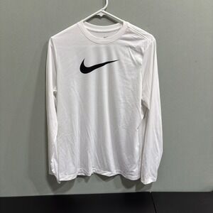 Nike Dri FIT long sleeve athletic shirt in white with a prominent black Swoosh logo. This shirt is designed for performance and comfort, utilizing Dri FIT technology to wick away moisture. The long sleeves offer added coverage and warmth, making it suitable for various athletic activities and training sessions.