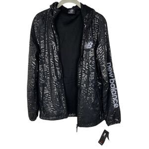 Brand new with tags New Balance monogram full zip windbreaker. This jacket has a fully perforated liner, 2 front zip pockets as well as, an adjustable drawcord hood and bottom hem to keep wind out. Elastic cuff sleeves. Reflective logo on left sleeve and chest.