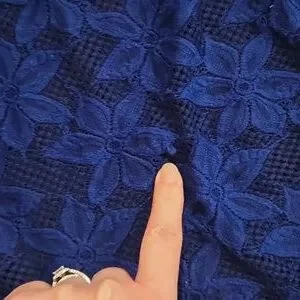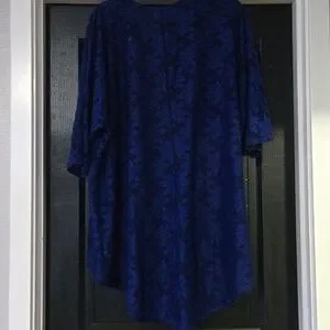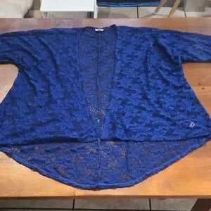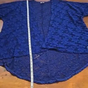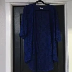 Lularoe blue floral lace kimono. Size medium but has an oversized fit and the fit can be customized since it's open front. PTP is approximately 30 inches and the length is approximately 26.5 inches in the front and 35 inches in the back. Long enough for leggings! Good pre-owned condition. No holes or pilling but I did find two small snags that aren't noticeable. One snag is on the right shoulder and the other is on the left in the front. Fabric is 94% polyester and 6% elastane and is pretty stretchy.