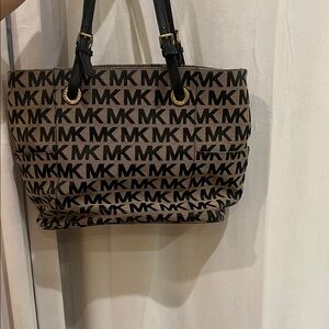 Elegant Michael Kors tote with iconic monogram design. Features black handles and tan body. Ideal for daily use.