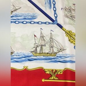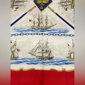 Authentic Vintage Hermès silk carré titled “La Marine en Bois”, designed by Hugo Grygkar. This classic maritime design features detailed wooden sailing ships, nautical flags, chains, and anchor motifs. A highly collectible and timeless