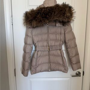 Stay warm and chic with this ZARA belted puffer jacket in a beautiful taupe/beige neutral. Features a plush faux-fur trimmed hood, cozy faux-fur interior lining, and a cinched waist with adjustable belt for a flattering silhouette. Faux -fur is removable.