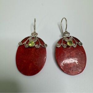 Coral and Peridot Sterling Silver Earrings Oval 925 Scrolled Hook Wires Bohemian