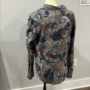 Men’s paisley shirt, featuring a blue and orange design. Button up. Western vibe. Add some fun to your wardrobe.