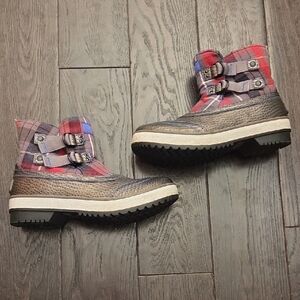 Stylish ankle boots with red plaid design. Features buckle accents. Comfortable and durable. Small scuff on toe.