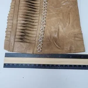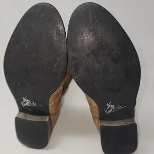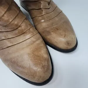 Burnished leather boots have a round toe with intricate ruching along the top. with vented panels along the back that have twisted strips of leather trimmed in decorative whip-stitching along the outside. 1.25" wooden heel. Cushioned insole; Non-skid rubber sole.