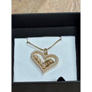 An elegant Gucci heart-shaped pendant adorned with pearls and a signature logo rests on a 16" gold-plated chain. Comes with an authentic branded box.