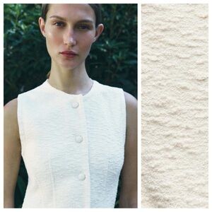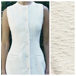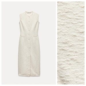NWT. Zara ZW Collection Ecru Cotton Blend Textured Shift Midi Dress with a round neck and sleeveless design. Featuring front welt pockets, textured fabric and frayed trims. Concealed button-up fastening in the front. Size M. Ref. 8812/730. Pit to pit 17" flat, shoulders 15", waist 15", length 50". 1072