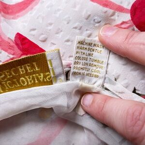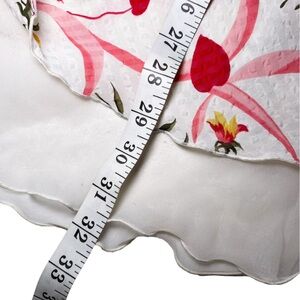 • Pattern & Print: The white fabric is adorned with a playful print of pink swirling ribbons and red hearts. Interspersed throughout are delicate floral clusters featuring red