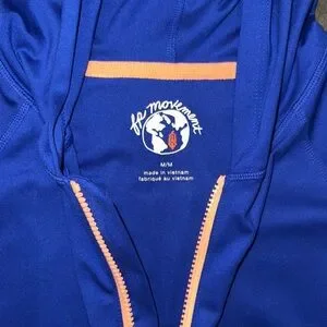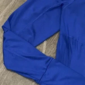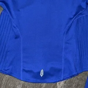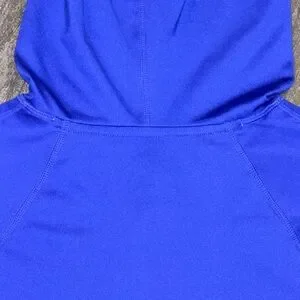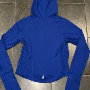 Features: Quick-drying fabrication; four-way stretch; attached hoodie; thumb holes; scrunched paneling at sides creates flattering silhouette; scoop bottom seam