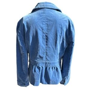 Beautiful blue velvety velour Talbots jacket with large round buttons, perfect with a pair of jeans or to add style to your business attire. Fully lined, mid-length, two front pockets near the hem and an additional breast pocket, all with button closures, pleat on the back, long sleeves and buttons at the neckline allow it to be worn in multiple ways, see photos.