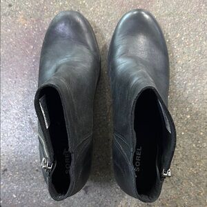 These Sorel ankle boots feature a sleek black design with a smooth finish and a rounded toe. The elastic side panels ensure easy slip-on wear, while the chunky medium-height heel adds a touch of elegance. Perfect for both casual and dressier occasions, these boots offer a classic and versatile style.