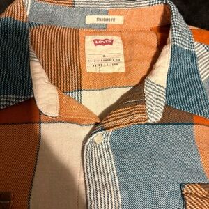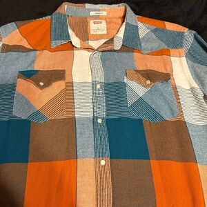 Levi's casual button-down shirt with a bold plaid pattern. Features blue, orange, and white colors. Ideal for everyday wear. Measurements 22 inches length, 23 inches pit to pit. Pet & smoke free home. No visible flaws.