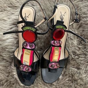 Yves Saint Laurent Patent Leather Crystal Embellishments T-Strap Sandals