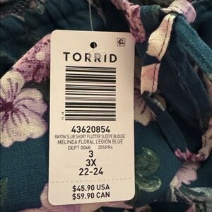Torrid Slub Short Flutter Sleeve Melinda Floral Legion Teal Blue Women's Top 3X