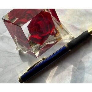 This is a rose captured in resin, likely from around the 1970s. Its very pretty and would make a great, unique gift for Valentines Day - who wants roses they have to throw away later anyway?