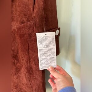 New with original tags, this Chadwick’s genuine suede coat features a rich, warm brown tone with a soft, velvety finish. Crafted from real suede leather, the coat has a classic tailored silhouette with a notched lapel collar, button-front closure, and functional pockets for everyday wear.