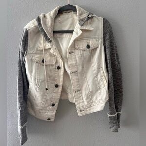 Chic hooded jean jacket with contrasting gray sleeves. Perfect for layering and casual style.