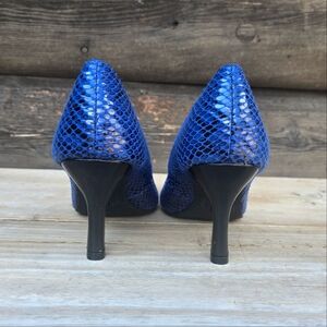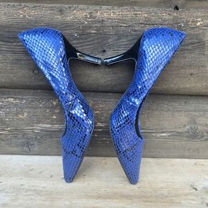Elegant blue snakeskin pattern heels. Sleek design with a pointed toe. Perfect for a stylish look.