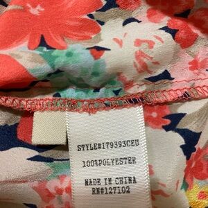 Colorful floral blouse with a lively pattern. Features pink, yellow, and green hues. Perfect for a cheerful look. Clasp at neckline and pleat down front center. 3/4 sleeves. Excellent condition!