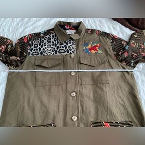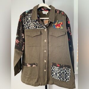 Stylish utility jacket with vibrant floral and animal print. Button front and practical pockets. Perfect for everyday wear. They call this their patchwork military jacket. Fun olive green with not only animal print, floral and embroidery as well. Jacket has 4 fri t pockets and is a full button. Size XL is 100% cotton.