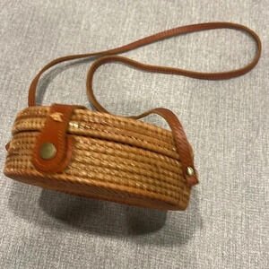 Handwoven Round Rattan Bag Shoulder Leather Straps Natural Chic Hand