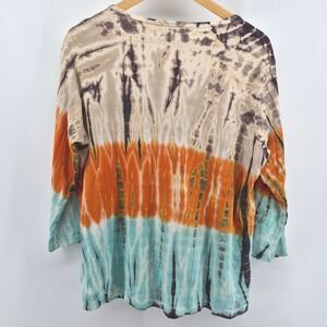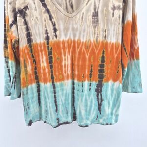 Keywords: Tryst tie dye top, Women's 1X tunic, 3/4 sleeve v-neck shirt, Orange brown aqua tie dye, Boho casual top, Plus size tie dye, Comfortable everyday wear, Unique pattern shirt, Relaxed fit tunic, Summer casual top, Spring fashion, Vibrant print blouse