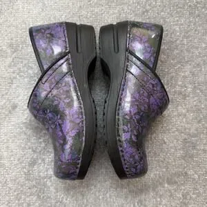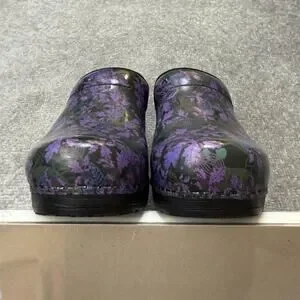 Style: Closed-back professional clog shoes with a purple floral print upper and black sole.