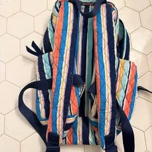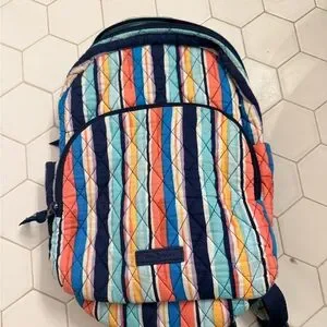 Colorful striped backpack by Vera Bradley. Features blue, orange, and white stripes. Ideal for school or outings.