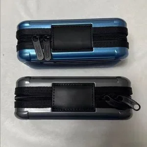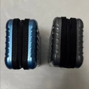 Pair of RIMOWA cases. One in metallic blue, the other in charcoal gray. Sleek and robust design.