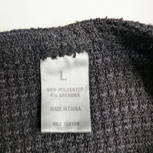 This product is a women's black waffle knit bralette or crop top, without a specific brand. It is in size large and features a solid black color. The top is athletic fit with a round neckline and sleeveless design. Made from a blend of polyester and spandex, this cropped style is perfect for women looking for a comfortable and versatile piece to add to their wardrobe.
