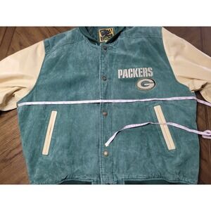 Keywords: NFL, Green Bay Packers, Varsity Jacket, Suede, Leather Sleeves, Snap Front, Team Apparel, Sports Fan Gear, Vintage, Collectible, Gameday, Casual Wear, XXL, Bomber Jacket