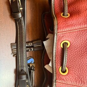Classic Dooney & Bourke drawstring pebble leather bucket bag. Will arrive from a smoke and pet free home. Length 11” x 4.5” x 12” high.