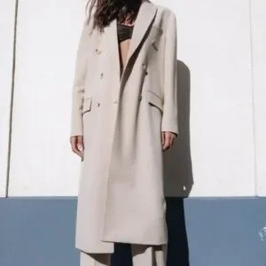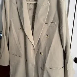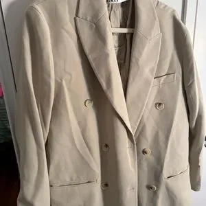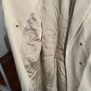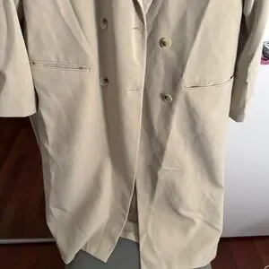 Elegant light tan coat with double-breasted design. Features classic button accents. Lined, two pocket design